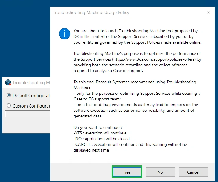 Click Yes in the Troubleshooting Machine Usage Policy panel.