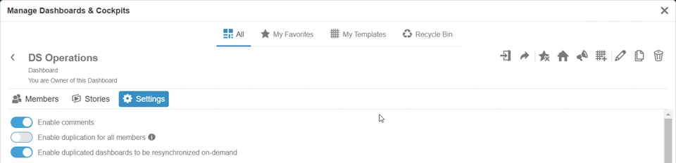 As a short reminder, this function allows on-demand propagation of changes from a source Dashboard to its duplicates. It also allows sharing a dashboard with others for their own use, without granting them owner right of the original Dashboard.