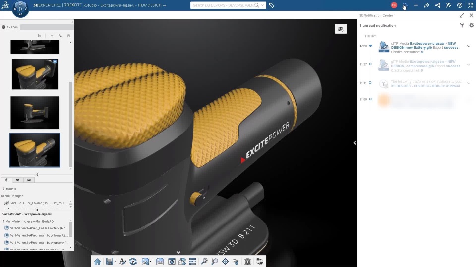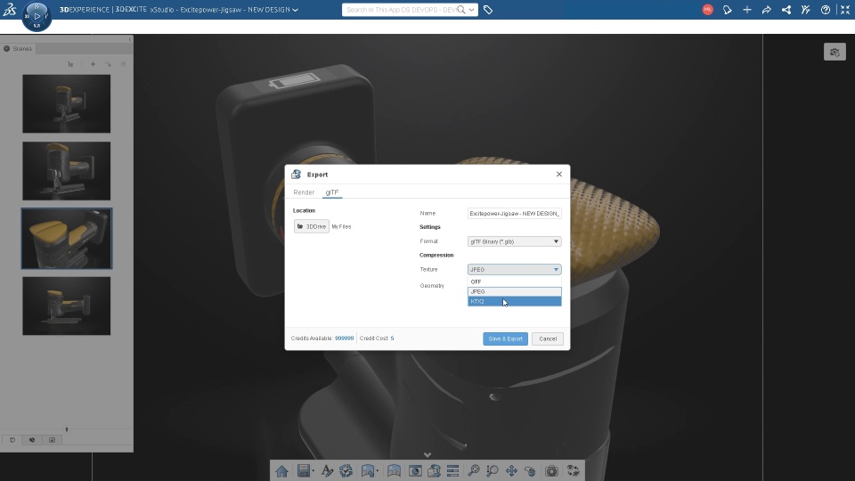 - Export the active scene in glTF™ format (.glb and .glTF) outside the 3DEXPERIENCE platform. Several texture (jpg or KTX2) and geometry compression options are available for maximum data reduction to optimize performance in web and on mobile.