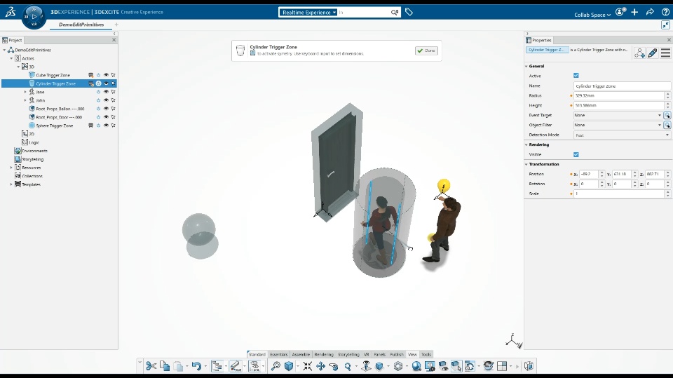- Manipulate the dimensions of a geometric primitive or a trigger zone directly in the 3D area.