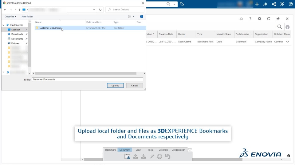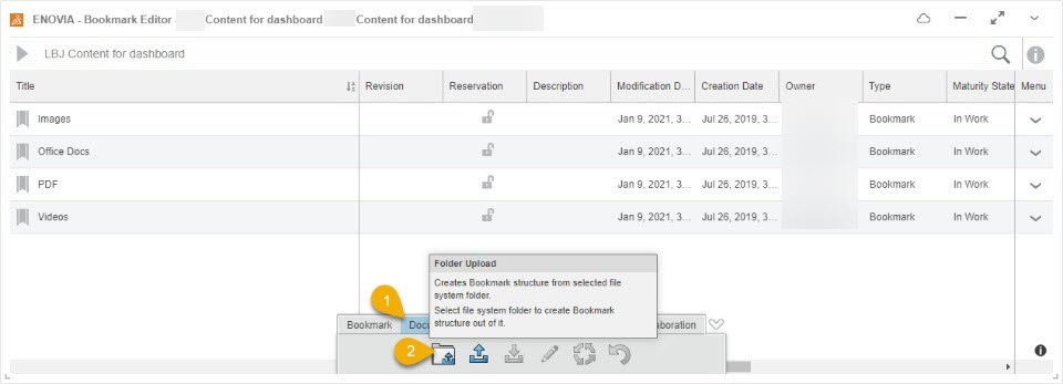 You can upload a folder from your computer to the Bookmark Editor app using the Upload Folder command from the action bar.
