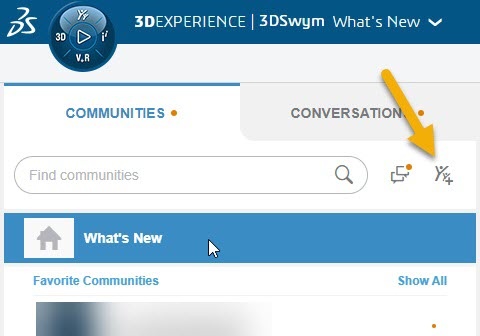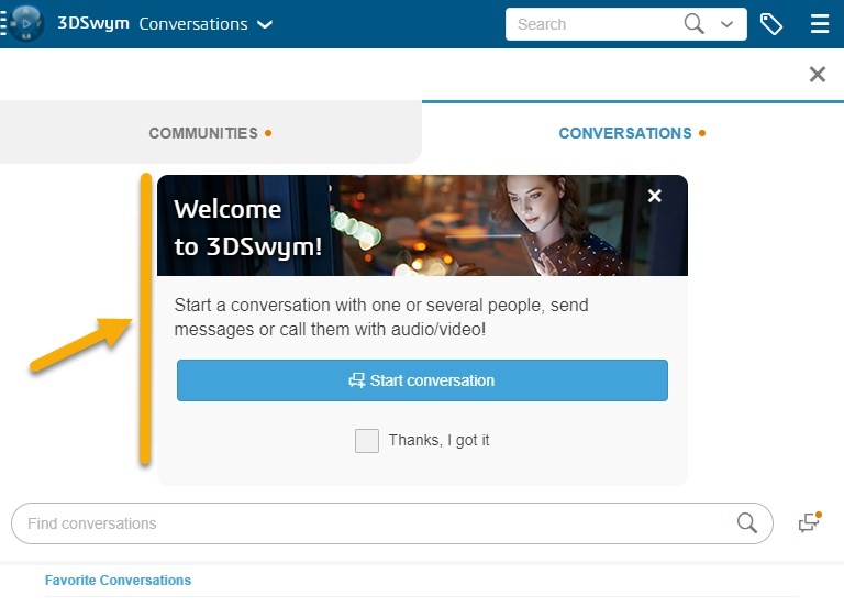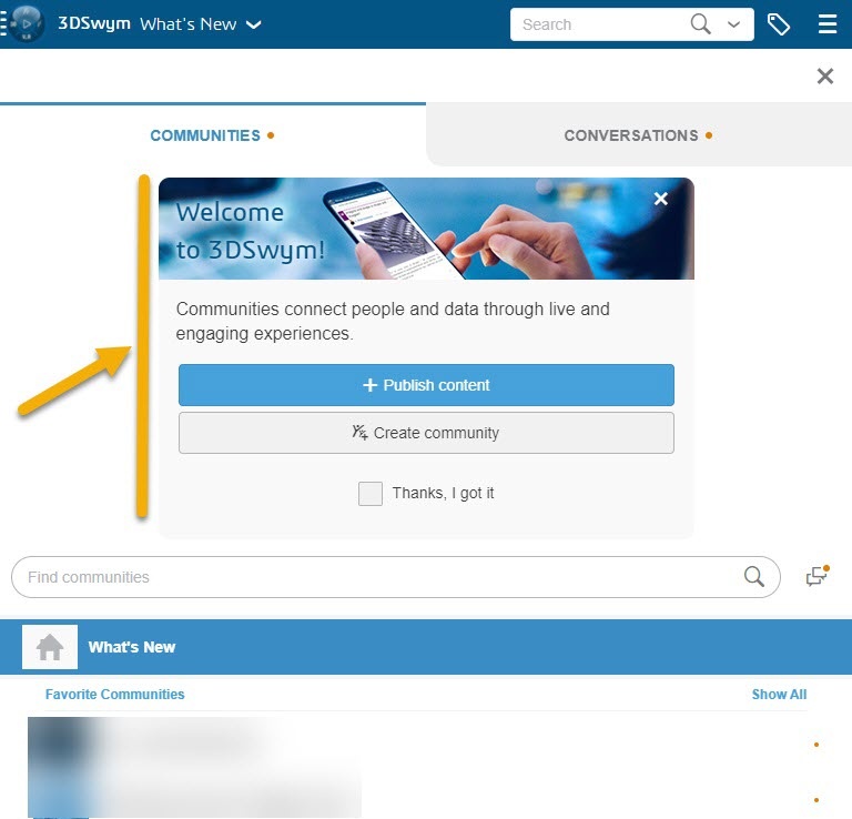 - A new welcome message is now displayed when you access 3DSwym for the first time. If you use a desktop or a tablet, the message is displayed in the What's New feed in the middle pane. The message is displayed in the left pane if you use a mobile device.