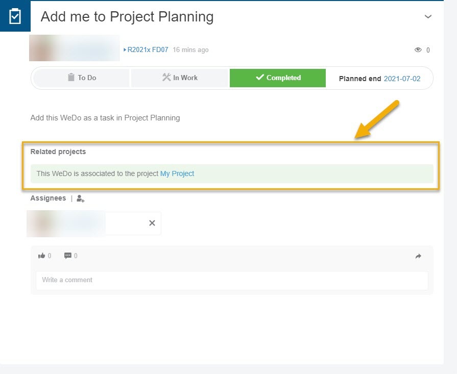 When a Wedo has been added to a project in Project Planning, the project name is displayed in the details of the WeDo.
