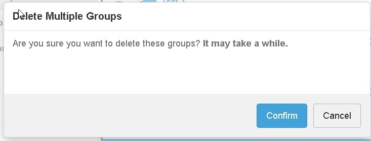 Once Delete Selected Groups action is selected, a confirmation panel pops up.