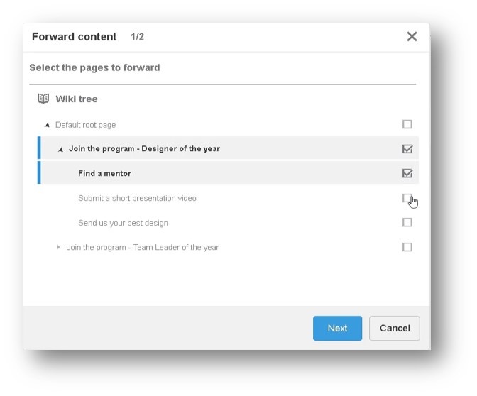 - Single page forward : A warning will be displayed if any media in the wiki page cannot be forwarded due to insufficient rights.