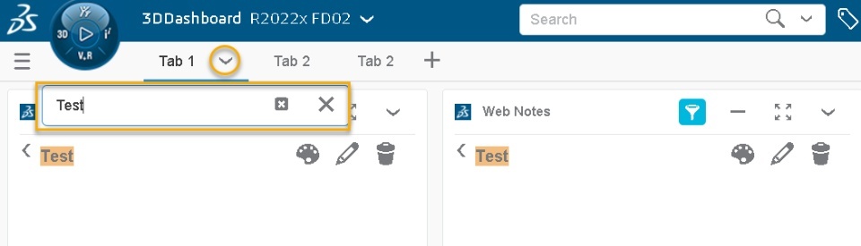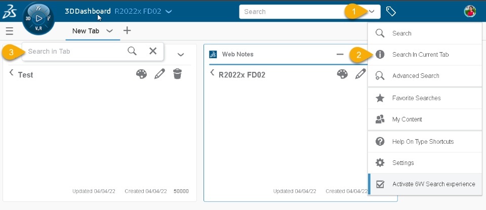 We can now search in each tab of a 3DDashboard with 'Search in tab' option under menu of each tab. It will display a search input as an overlay just beneath the tab name instead of focusing the top bar search input.