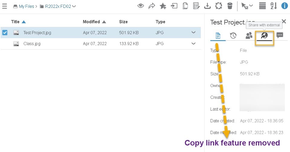 The "Access by link" tab is renamed "Share with external" and "Copy link" feature is now removed from the "Properties" tab.