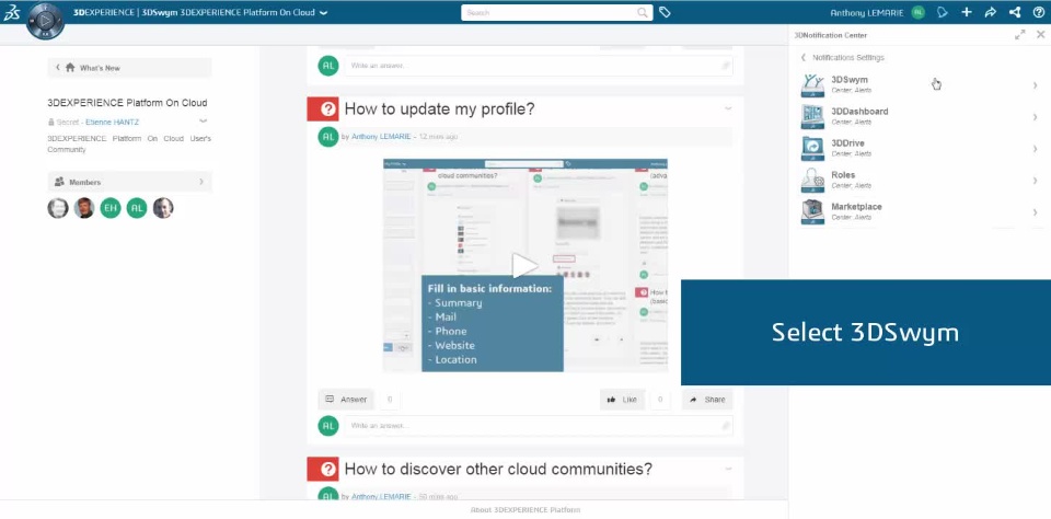 Directly on 3DSwYm*, it is possible to view in one single place the latest contributors’ activities that might need your attention: comments on your post, comments following yours, answers to your iQuestions, requests to join your community...This page is your 'notifications' tab and you can also define to receive your alerts by e-mail.