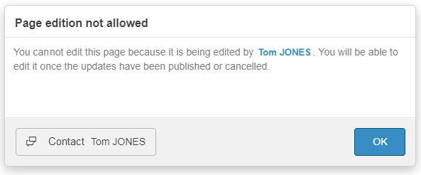 Other members trying to edit the same page will be informed of the concurrent edition and have the capability to contact directly the user (conversation opens in a new browser tab)