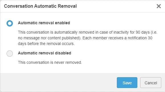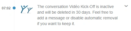 | Inactive conversations with automatic removal enabled will be deleted in the coming weeks. In the meantime, you can still change this setting on your conversation and switch on "Automatic removal disabled" to never delete your conversation. |