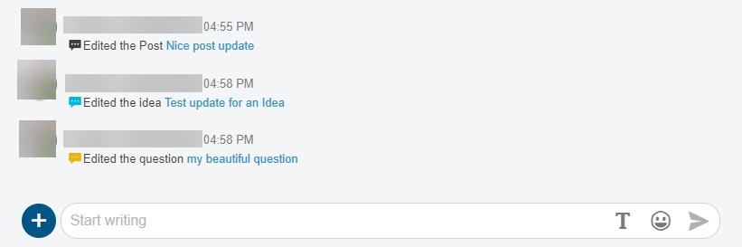 Each time a content is modified in a community or a conversation, an event will be displayed in the timeline, so that you can track latest content updates (Post, Idea, Question, Wiki).