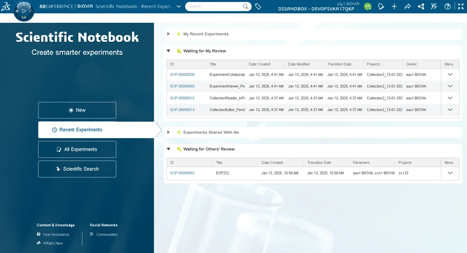 A streamlined user experience will enable Scientists to record their experiments more efficiently. Experiment Quick Filters are displayed to the user on log-in so that the scientists can quickly find their work. There is now a navigation panel that allows Scientists to easily navigate through sections and sections can be displayed in a continuous or docked manner. Experiment SMART text can be used to directly import materials into an experiment.