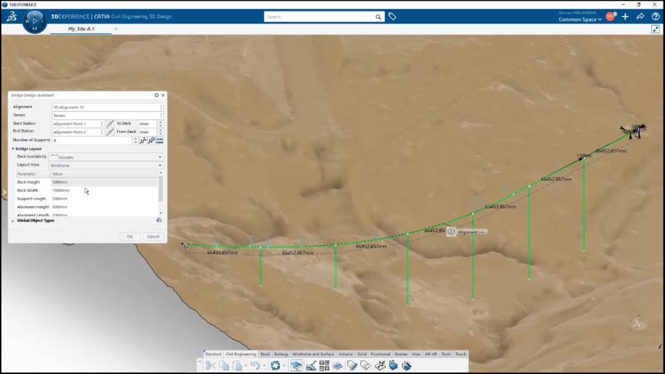 3. Bridge assistant enhancements greatly improve efficiency when designing simple bridge structures. The updated User Interface provide a simple and intuitive way for bridge designers to quickly define dedicated parameters, interact directly with the 3D manipulators, automatically create volumetric geometry and optionally instantiate custom user-defined parametric templates.