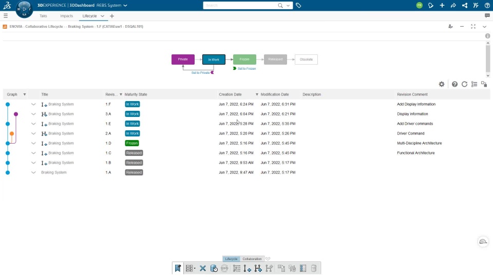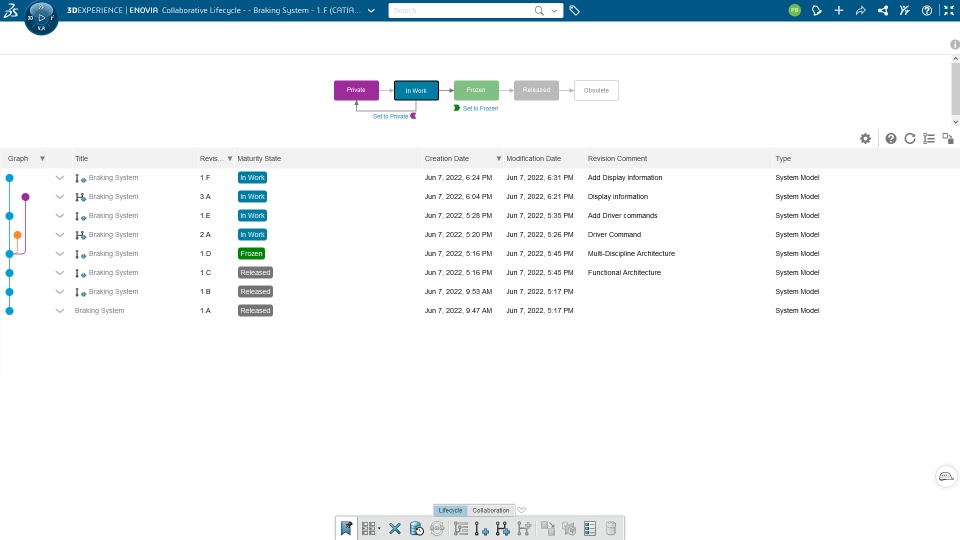From the 3DEXPERIENCE Dashboard, it is now possible to display revision graph and create new revision and/or branches of the UML SysML System Model.