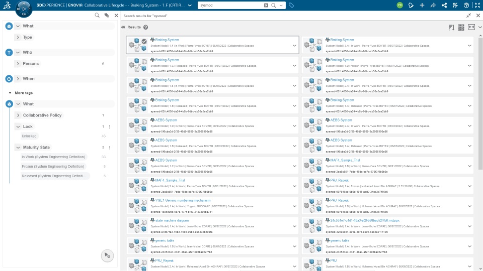 The System Architect can now benefit from the full 3DEXPERIENCE search experience for UML SysML System Model and directly open the model in CATIA Magic.
