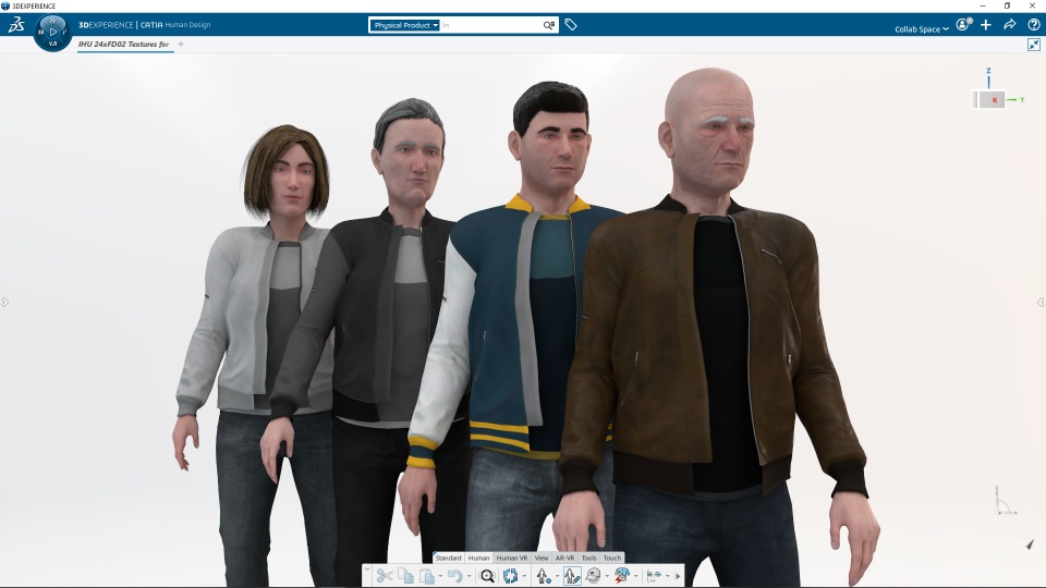 Connect virtual human in your kinematic simulation for a better mechanism study (Mechanical Motion Designer Role required). In 3DEXCITE Human Animation Studio, use "mechanism connection" command to attach some bones of the human skeleton to 3D Products of a mechanism. in CATIA Mechanical Systems Experience, simulate the kinematics of a mechanism, including the attached virtual human manikin. The produced animation can be stored in the associated physical product and consumed and replayed in 3DPlay or CATIA Product Perception ExperienceThe new generative humans have been enhanced to better represent aged people with detailed textures. In addition, new clothes and worker suits with different colors have been added