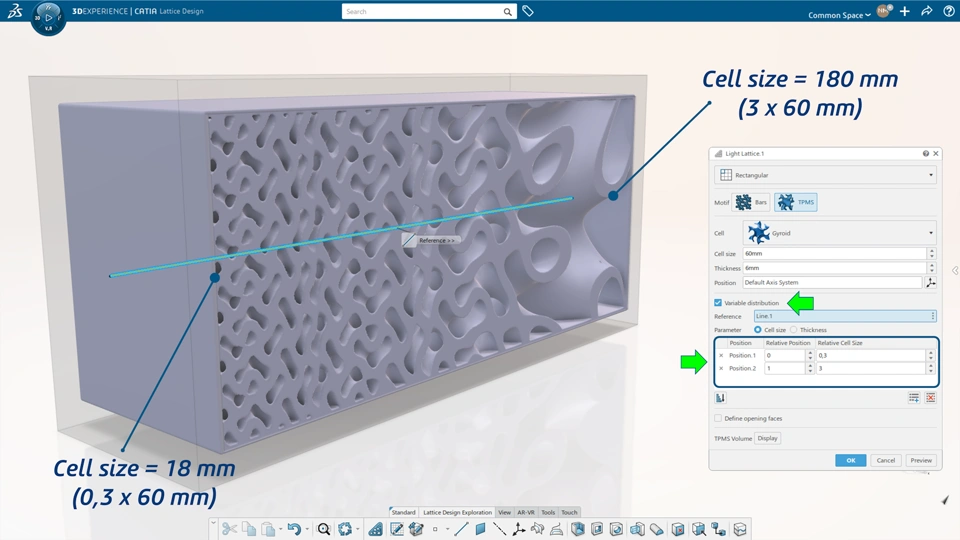 Video showcasing how to fine tune the distribution of the material of a triply periodic minimal surface lattice structure thanks to a new option Variable distribution