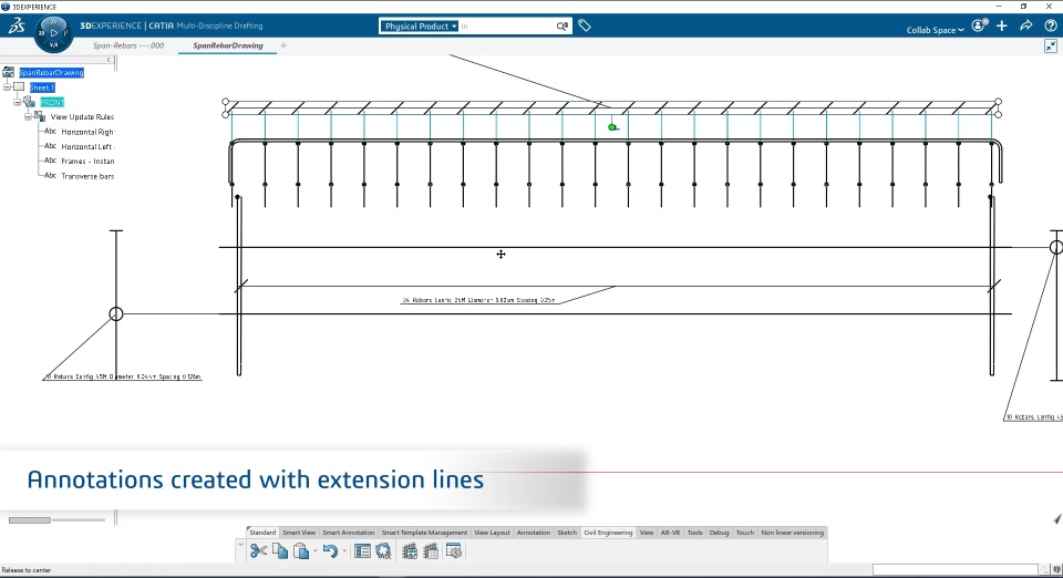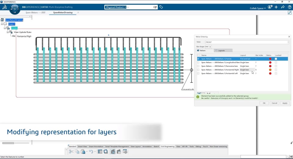 To facilitate the readability of rebar drawing, a new command called “Rebar drawing” has been introduced to define precisely the graphical representation and the annotations for each rebar layers using different modes to support the Construction industry standards. The rebar annotation is also supporting both “rebar centerline” and “rebar contour” representation in drawings