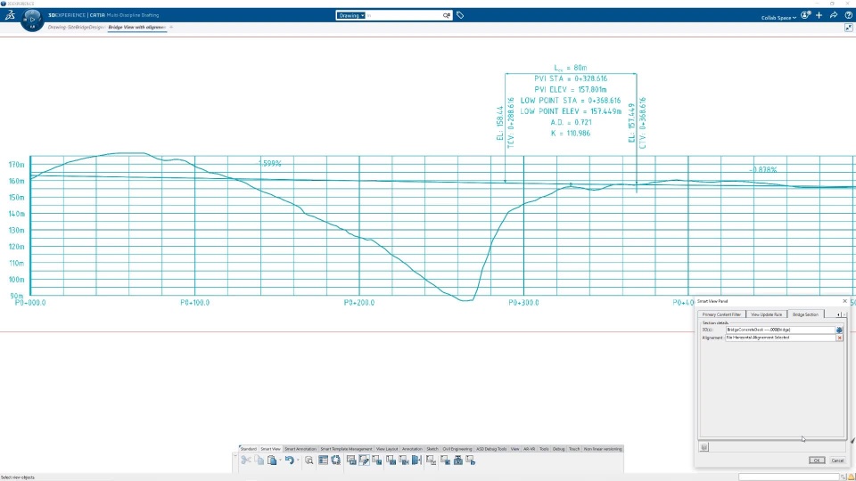 Extend the generation of civil infrastructure project drawings in context of its environment by representing in the same vertical alignment view, bridge, road & terrain data with their dedicated annotation, including additional annotation for grid stationing