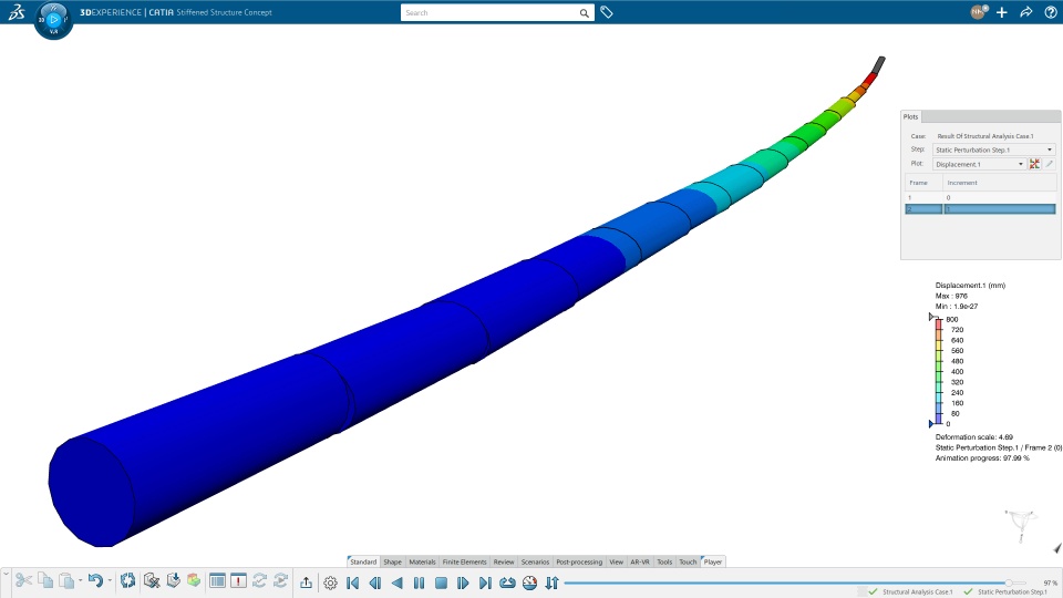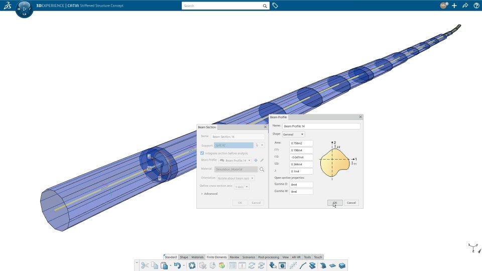 The whole blade design is reduced into a 1D beam equivalent model thanks to idealization techniques provided in the Stiffened Structure concept app