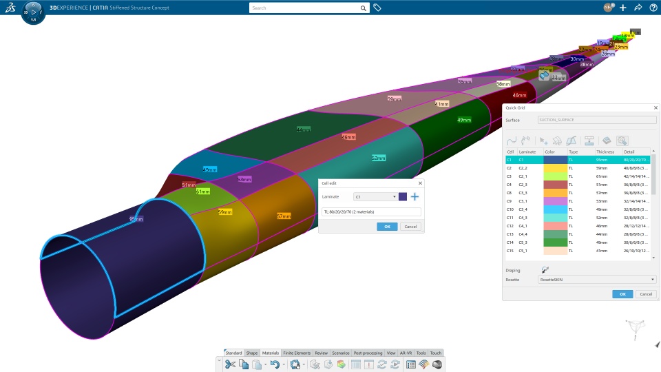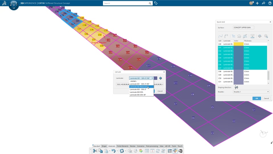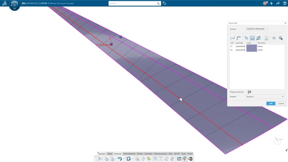 Quick Grid command: Composites materials are used for this concept: laminate definition is assigned to the wing surface