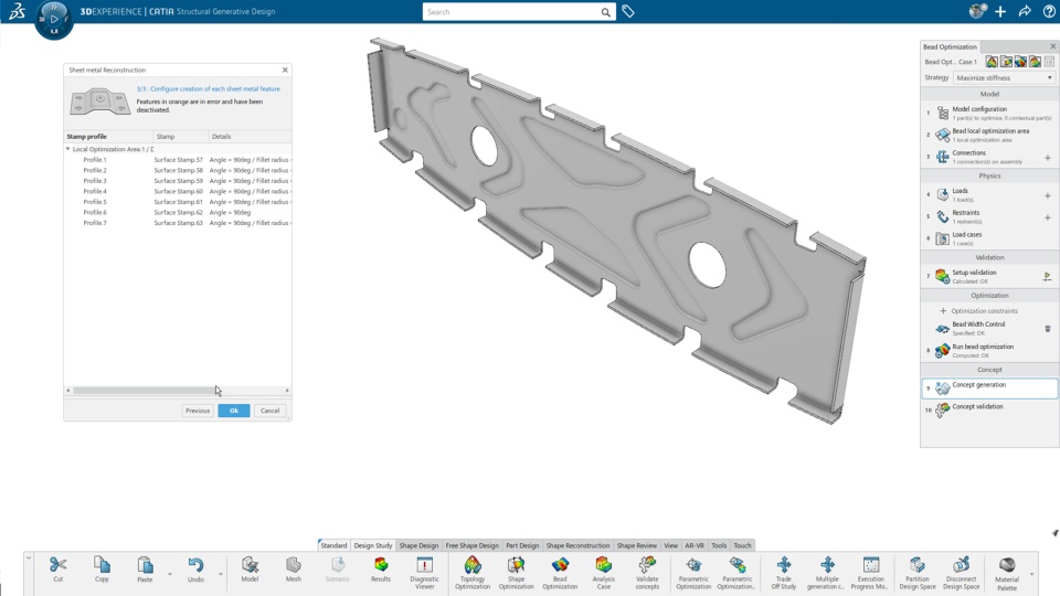 Image that shows the sheet metal reconstruction performed through the Concept Generation command that guides the user during the creation of sheet metal stamp leveraging different bead approximation profiles and strategies.