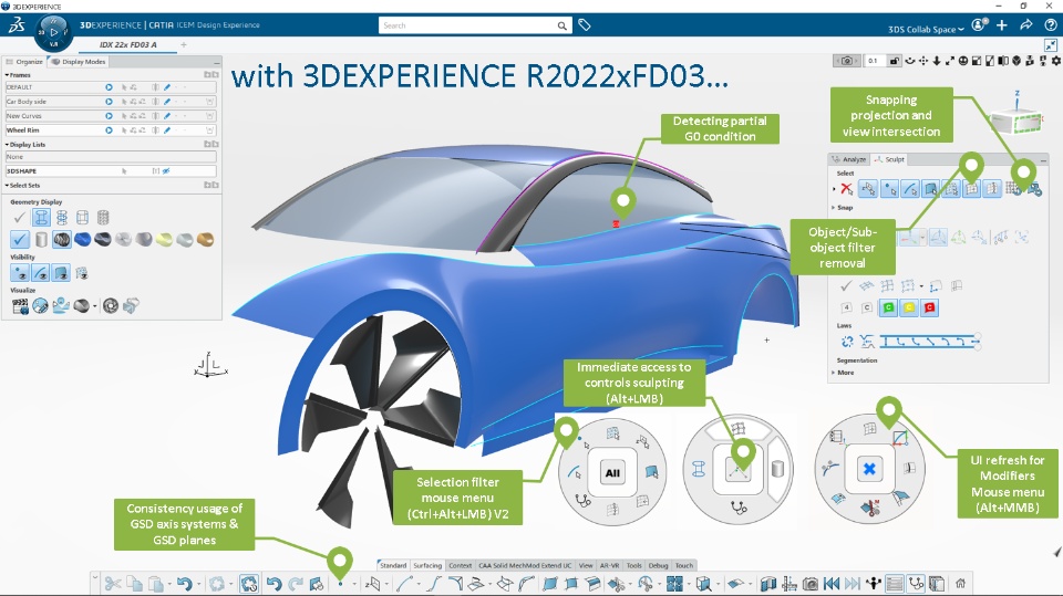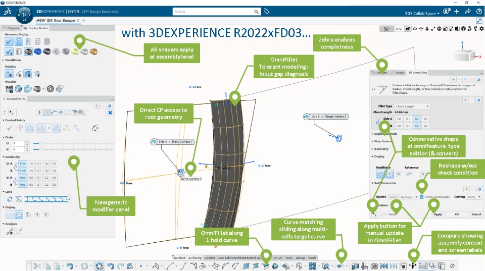 3DEXPERIENCE R2022xFD03 is a very rich release for ICEM Design eXperience bringing the app to a new level in terms of functional scope, modifiers flow, and productivity. Especially concerning overall usability, fillet, and diagnosis now considering also the assembly context for managing technical reviews