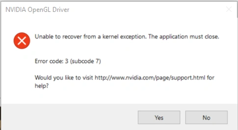 Unable to recover from a kernel exception. the application must close. Error code: 3 (subcode 7)