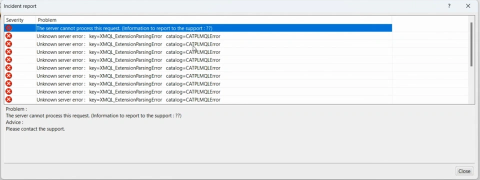 Unknown server error: key=XMQL_ExtensionParsingError catalog=CATPLMQLError