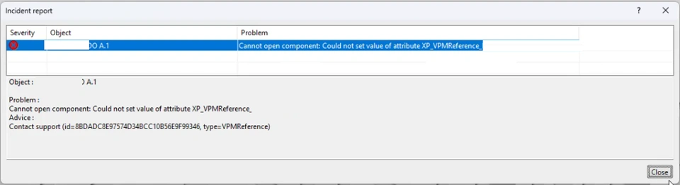 Cannot open component: Could not set value of attribute XP_VPMReference.