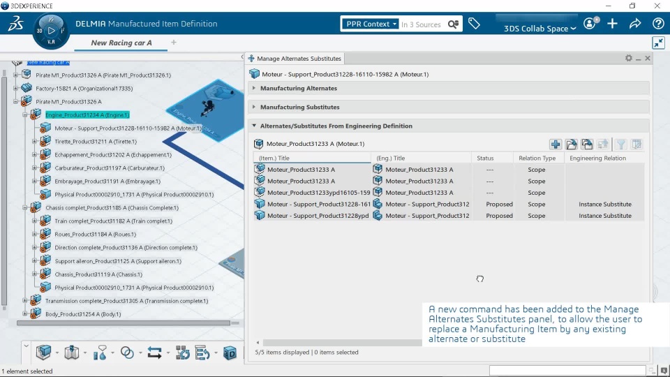 New command to replace a selected Manufacturing Item by any existing alternates or substitutes defined on associated Engineering Item