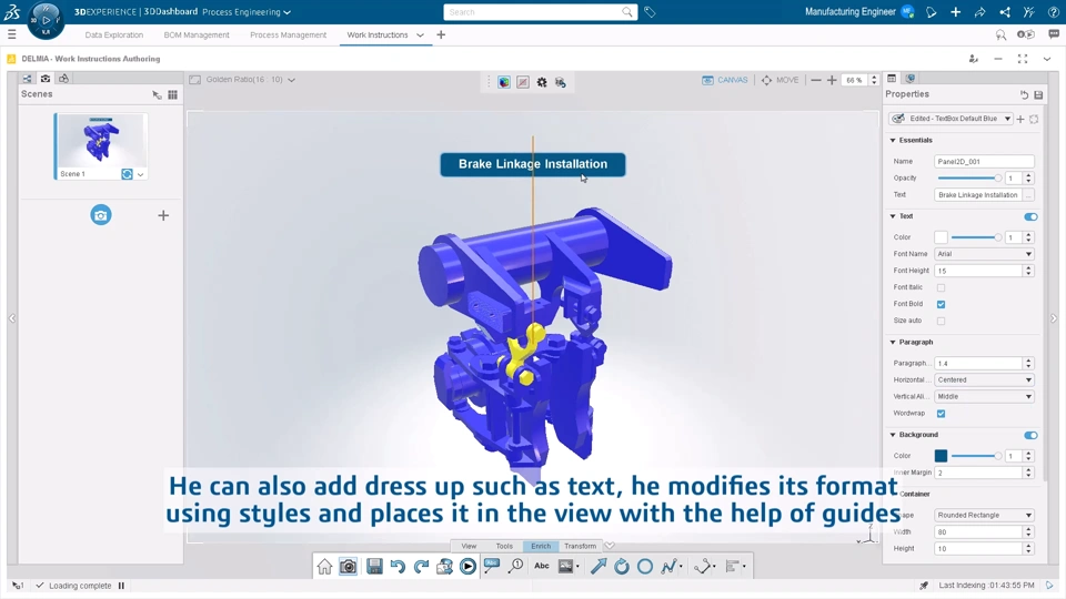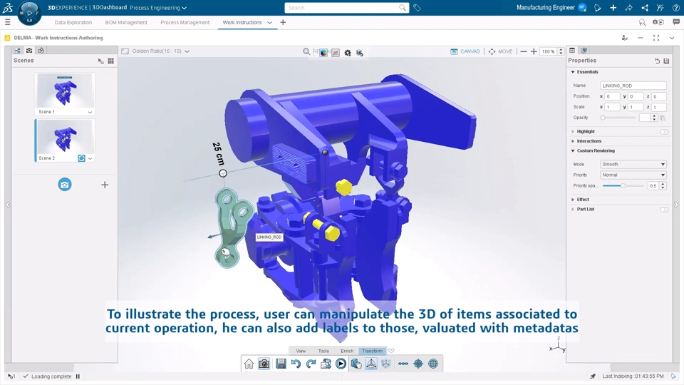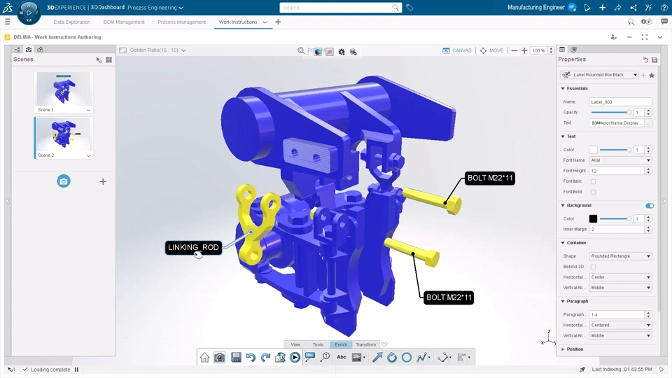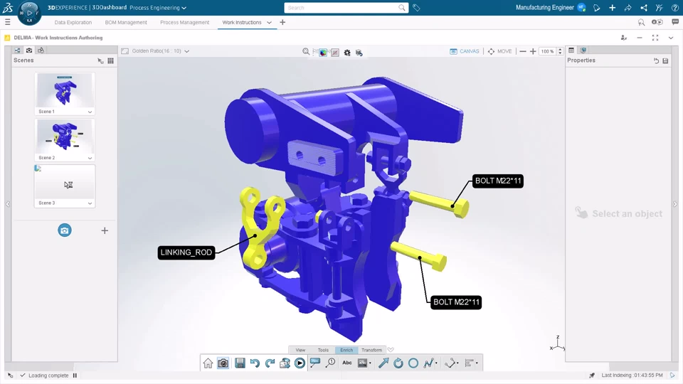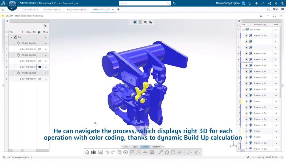 New cutting-edge, web-based experience for 3D Work Instructions definition. This solution leverages 3D data and operations build-up to illustrate process steps in the right context. Additionally, it accelerates work instructions authoring with a groundbreaking user experience, allowing multiple views management, 3D manipulation, and model-based dress up creation.