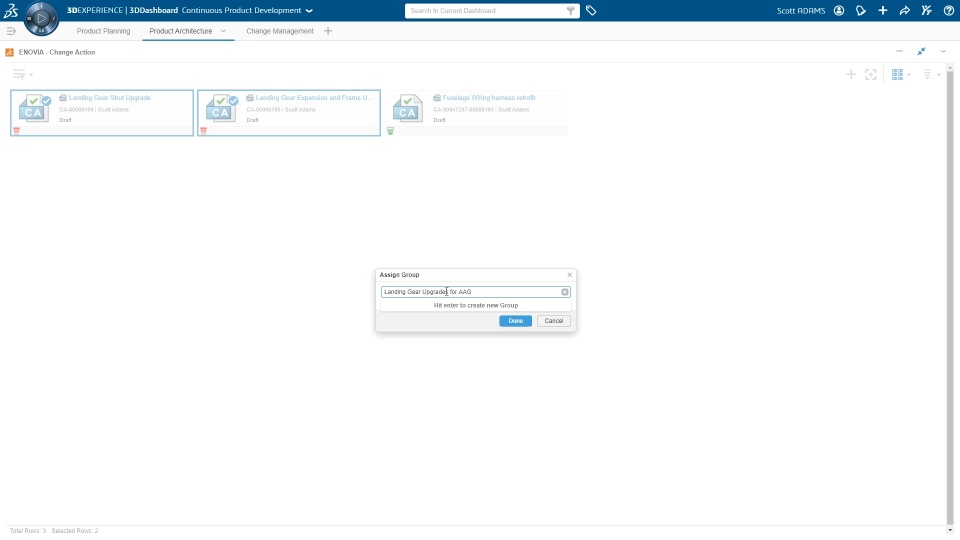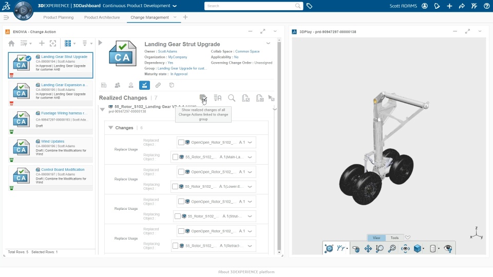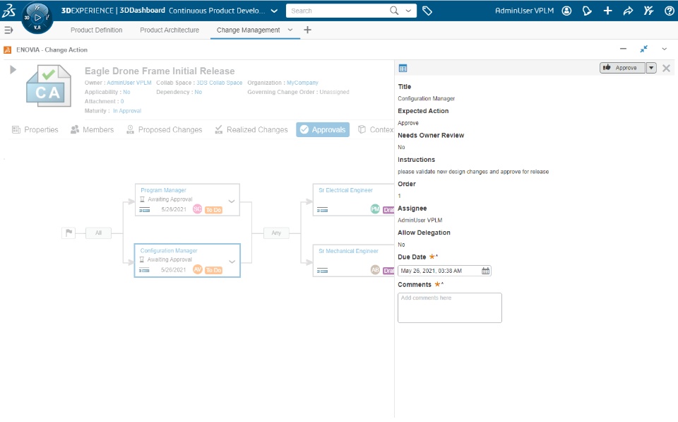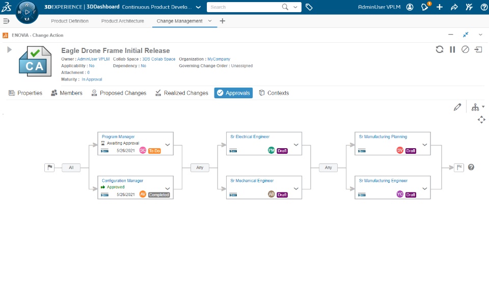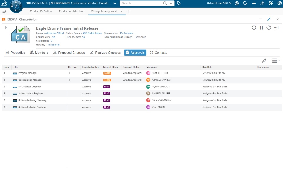 Allow change action owners to group change actions for concurrent modifications on the same reference object and track all modifications from multiple engineers working with different change actions. Change Owners and change actions participants can now visualize and monitor the change action's approval status and review posted comments during the approval of the change action . Visualize and monitor in graphical view the approval progress from a change action New Approvals tab
