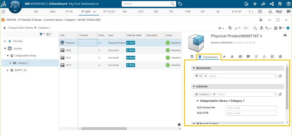 Classification related information is regrouped in a dedicated tab of the information panel. In this tab, user can manage the current classification of the data (Bookmarks, Libraries, IP Export Control) and edit classification attributes values