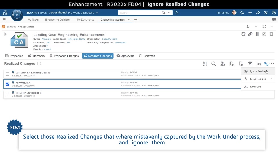 Provide change action assignees the ability to mark non-relevant Realized Items as ‘Ignored’ to improve the effectiveness of approval and validations.