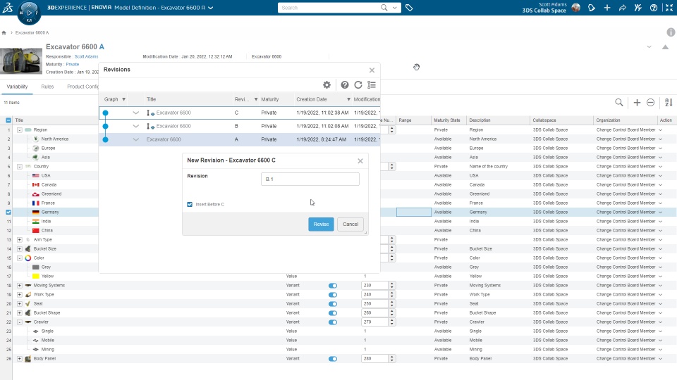 Product Managers can quickly modify variant values across multiple product configurations using the compare screen. Product Managers can quickly modify variant values across multiple product configurations using the compare screen. The edit of multiple product configurations maintain their accuracy and remain valid as each selection is validated against the configurations rules defined under the model version Product managers quickly insert new revisions by selecting the "Insert Between" checkbox on the Revisions Graph. Allow product managers to adjust the model version evolution deliveries with the new insert between revisions command available from the Revisions Graph.
