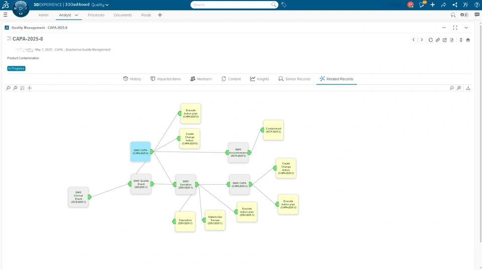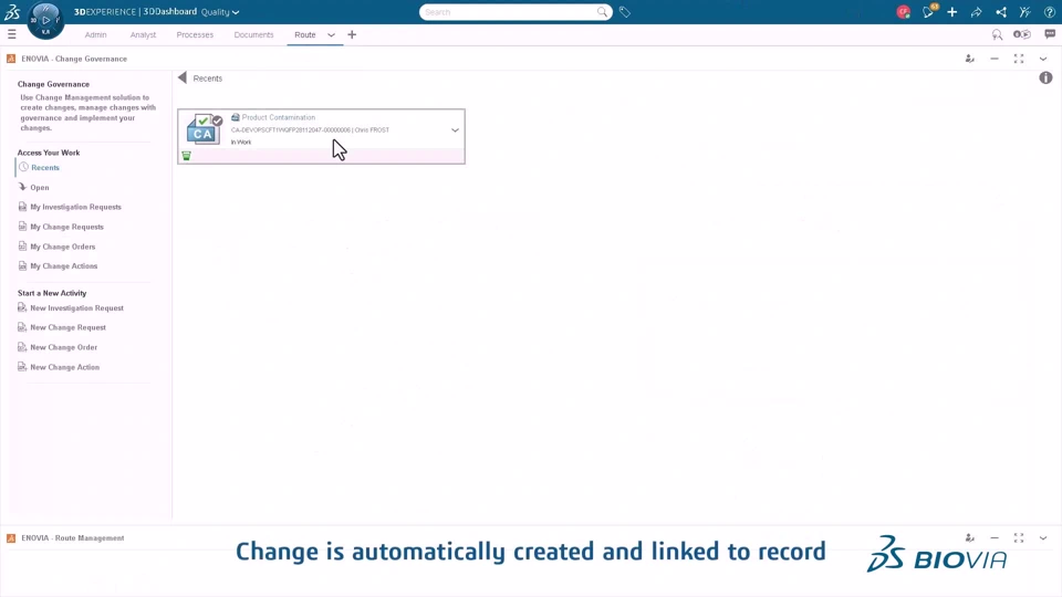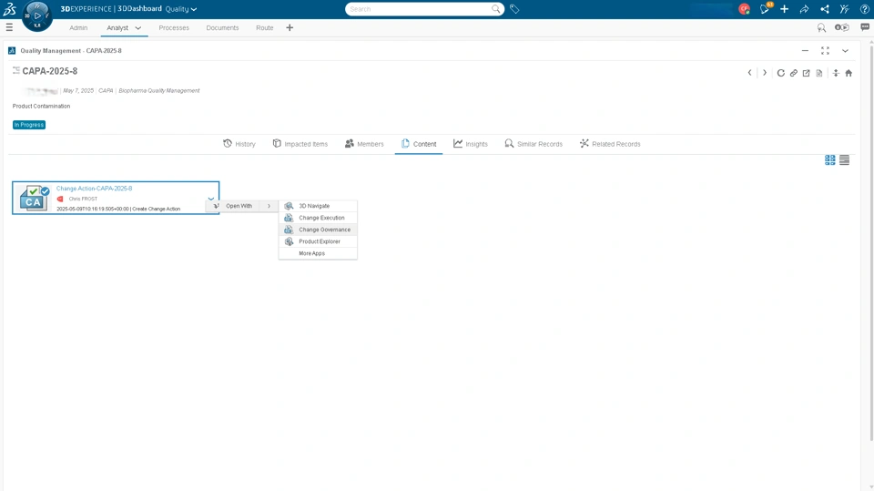 Screenshot showing the integration with Change Governance (creation of a change action from CAPA or Change Control)
