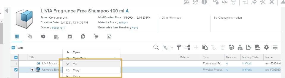Cut or copy and paste product/s in the product structure(instance view) across nodes saving time for users when defining complex multi-level structures.