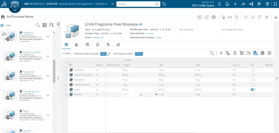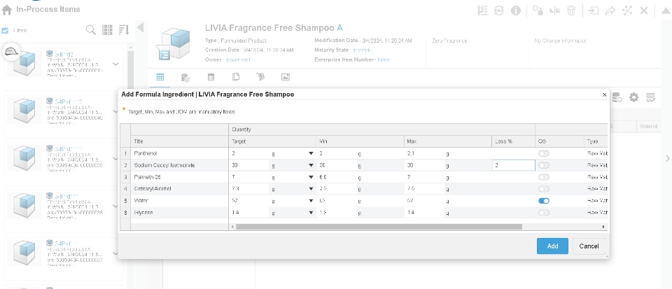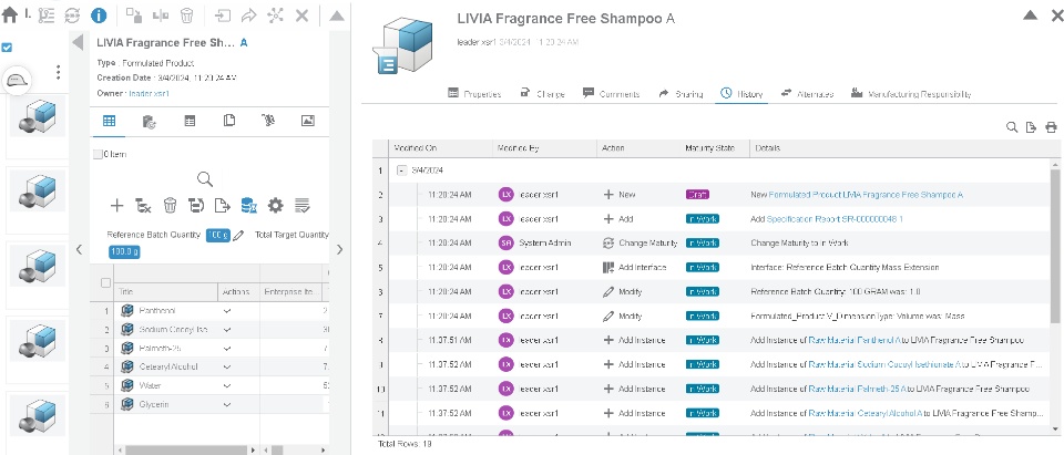 Author and manage Performance specifications and characteristics on Manufacturing Items; Improved productivity for defining the product structure by enabling specification users to cut, copy and paste child items across the BOM nodes; Enable formulated product recipes to be authored in weight quantities