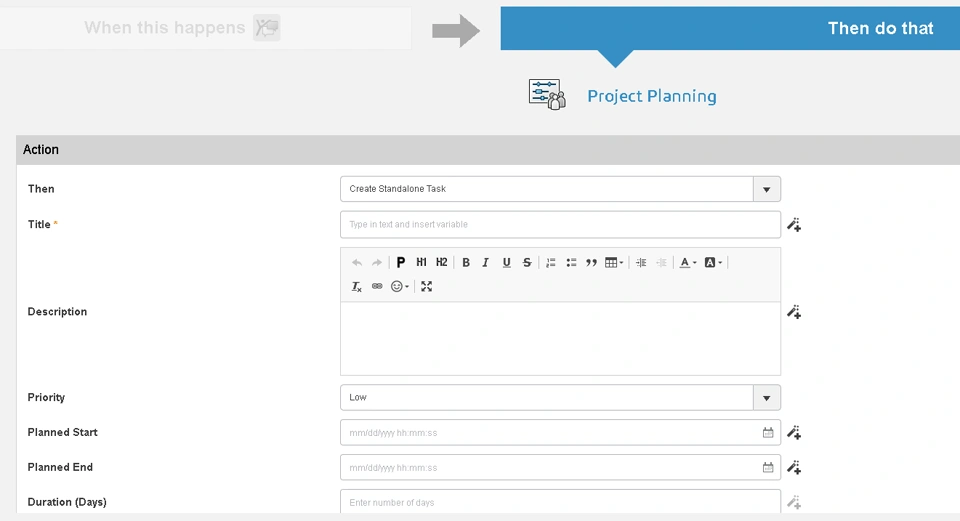 Create Standalone Task action in the Project Planning ingredient has been updated to include the following new input parameters:
