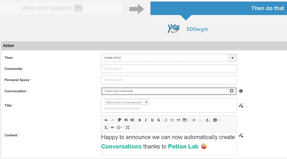 Business Process Play app has been added as an Action ingredient ("Then" side) for Potion Lab allowing you for instance to start a business process when a document has been created with a specific title.