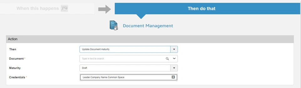 New action to Update Document maturity that allows you to change the maturity state of the specified document in order to automate document handling. For example, you might have documents coming from a supplier and you want to create these documents directly in the published maturity state (Released).