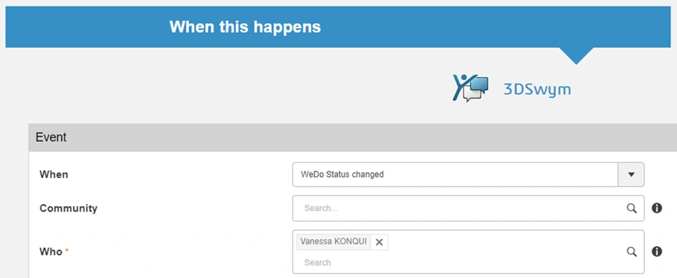 A trigger WeDo Status changed allows you to select either a community or a person in the Who field to define the context for the trigger definition.