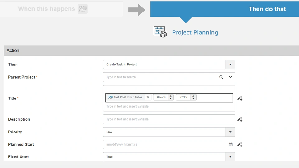 For example, as an action for Project Planning, you could use Table in the Title or Description fields to use table content from 3DSwym when creating a task. You then specify the row and column numbers to use. The table data is used as a title when you select the action Create Task in Project.