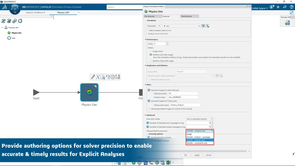 Provide authoring options for solver precision in the Physics Simulation adapter to ensure accurate & timely results for Explicit Analyses