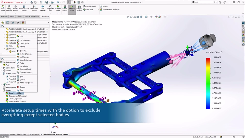 Description: Accelerate study setup times with the new UI option to exclude everything except selected bodies. Concentrate on what is important by removing parts or bodies excluded from the simulation study.