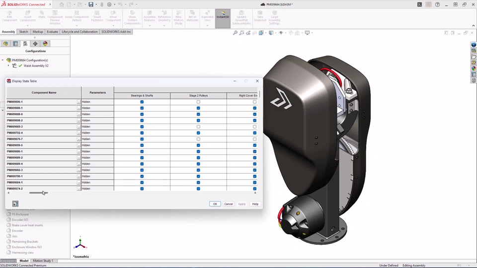Benefit: In assemblies with multiple display states, you have more flexibility and control over Hide/Show of components by using the new Display State Table.