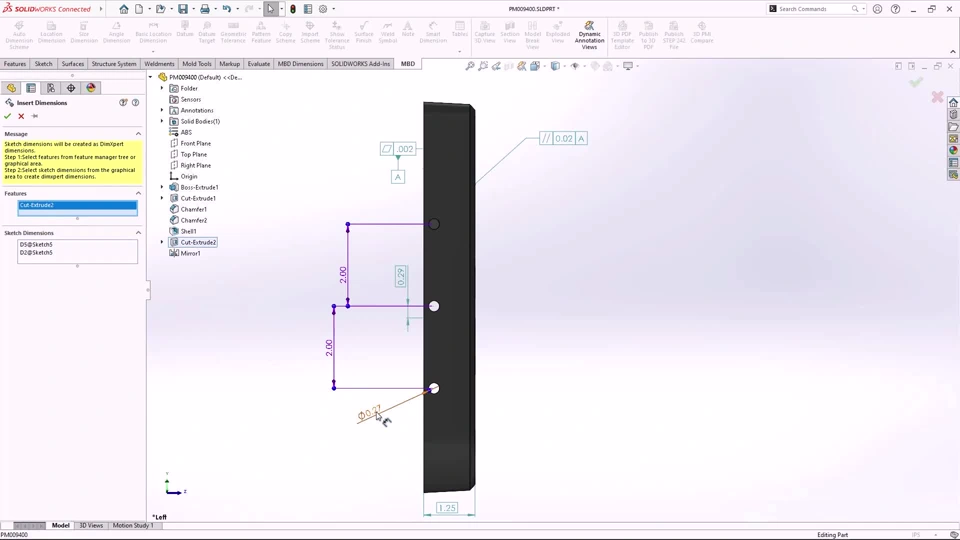 Description: Create DimXpert dimensions from Sketch and Feature dimensions. The new option, Insert Dimensions, enables you to select Sketch and Feature dimensions to be used as DimXpert dimensions.