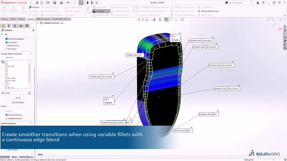 - Create smoother, more aesthetically pleasing designs with the Continuous edge blend option for variable fillets
