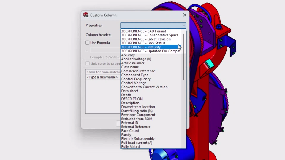Benefit: The ability to assign a color to a property value helps you instantly interrogate your assemblies to find out information available through the 3DEXPERIENCE platform, such as which components have a specific lock status, maturity level, CAD format, and more. Add custom properties including vendor, cost, and expected delivery date.